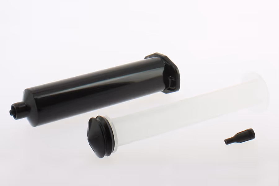 Inhalt: Kartusche, Handkolben mit Stopfen und Kartuschenverschluss. Der Handkolben ist nicht in die Kartusche eingesetzt.